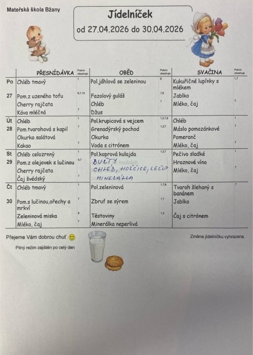Samozřejmostí je dodržování pitného režimu. Děti mají po celý den k dispozici výběr z několika druhů nápojů, včetně vody.